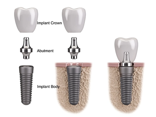Dental Implants are made of three pieces: the implant body, the abutment and the implant crown. The implant body is the screw, the abutment is the connection piece between the screw and the crown. The implant crown is the piece of the implant that looks and functions like your natural teeth.